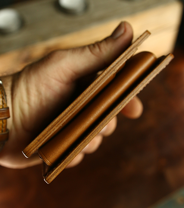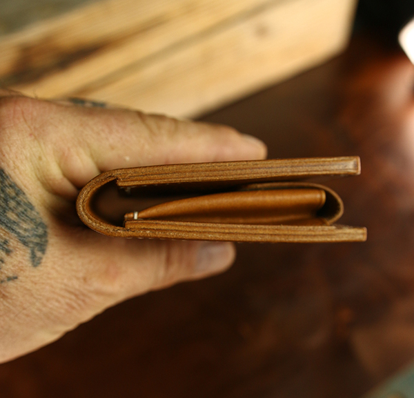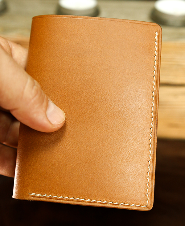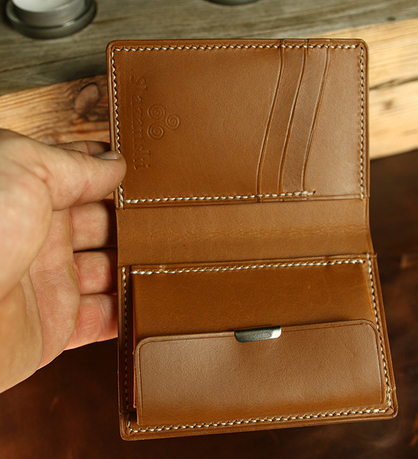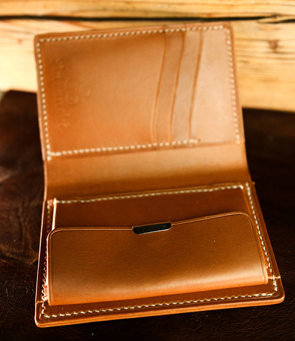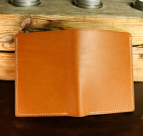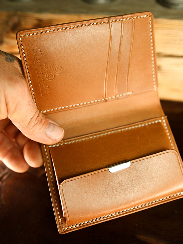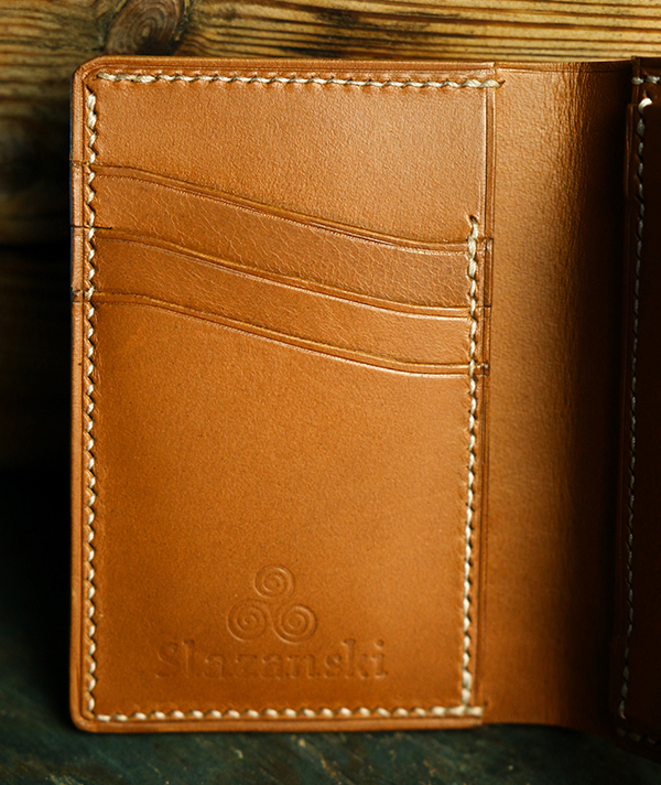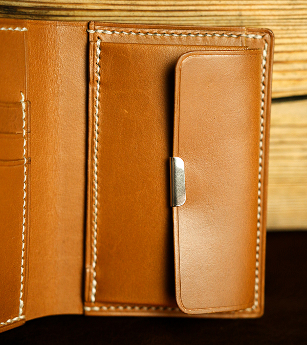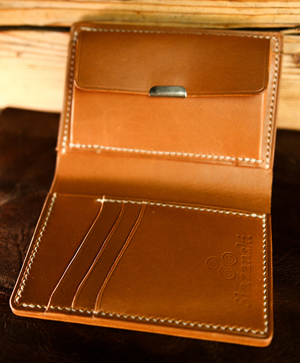 - Hand-sewn wallet for three cards, coins, banknotes and two inner pockets.