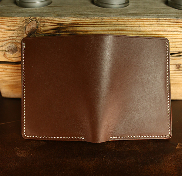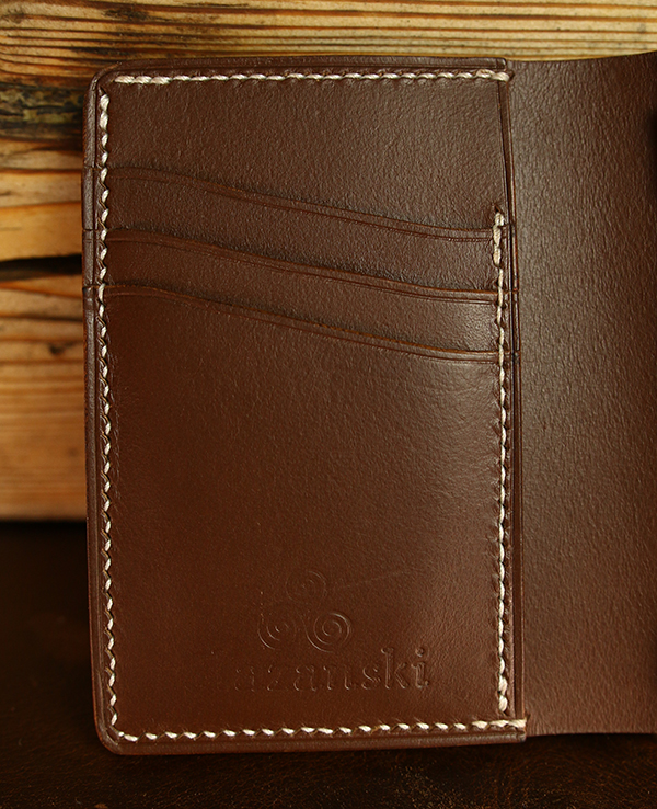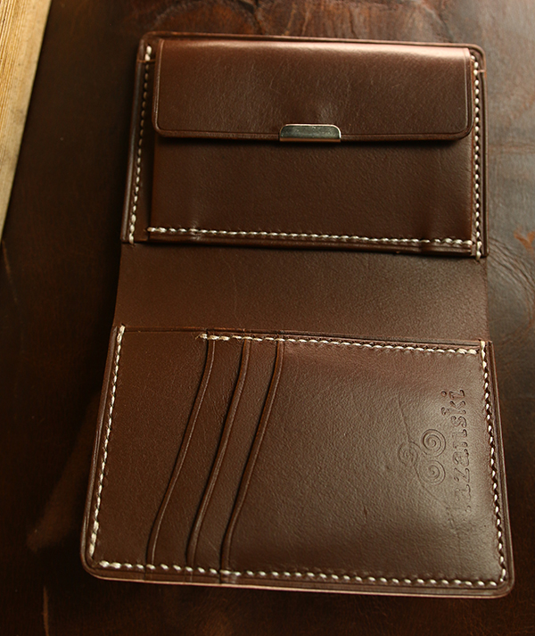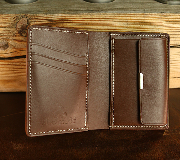 - EN: Hand-sewn wallet for three cards, coins, banknotes and two inner pockets.