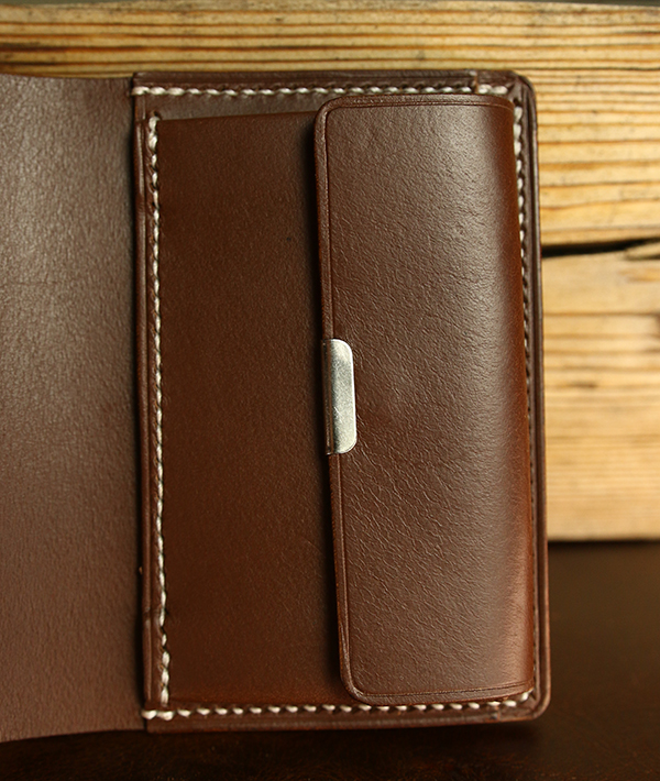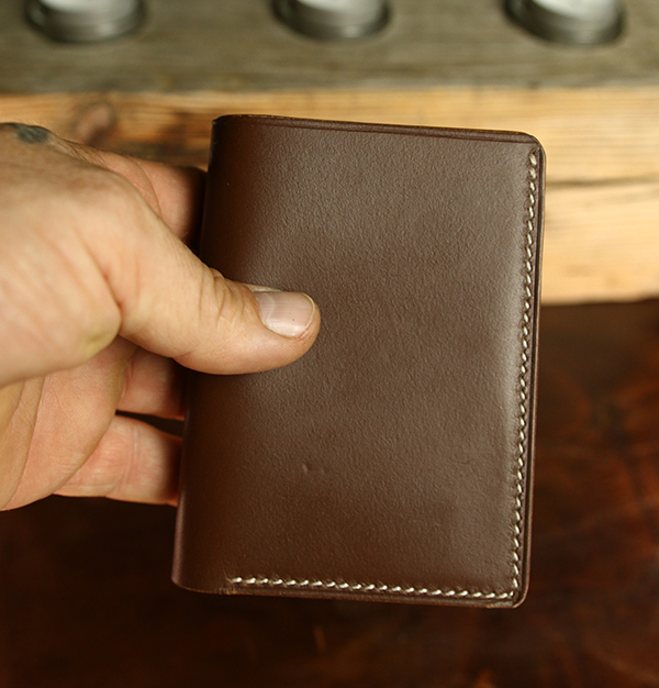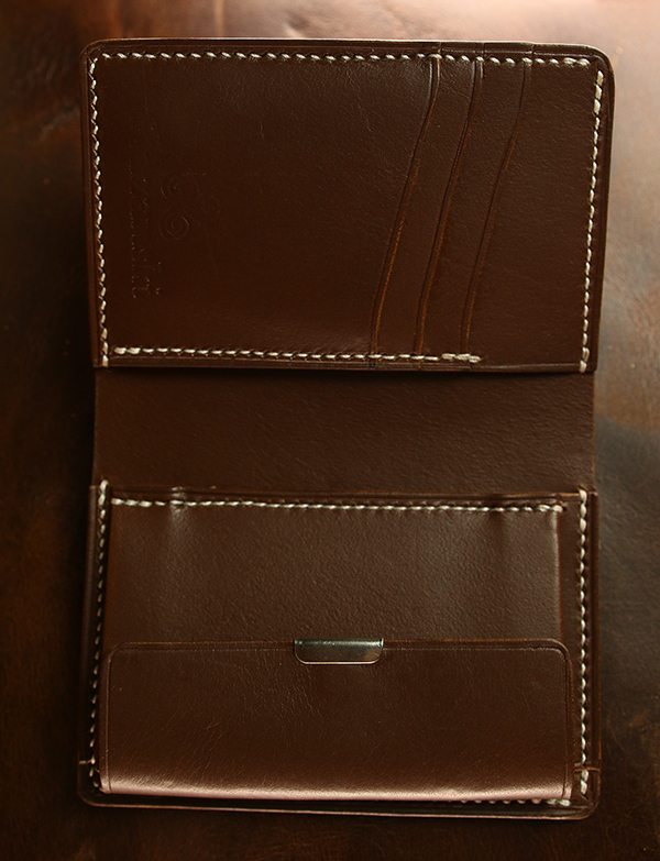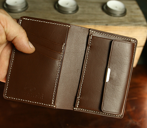 - Hand-sewn wallet for three cards, coins, banknotes and two inner pockets.