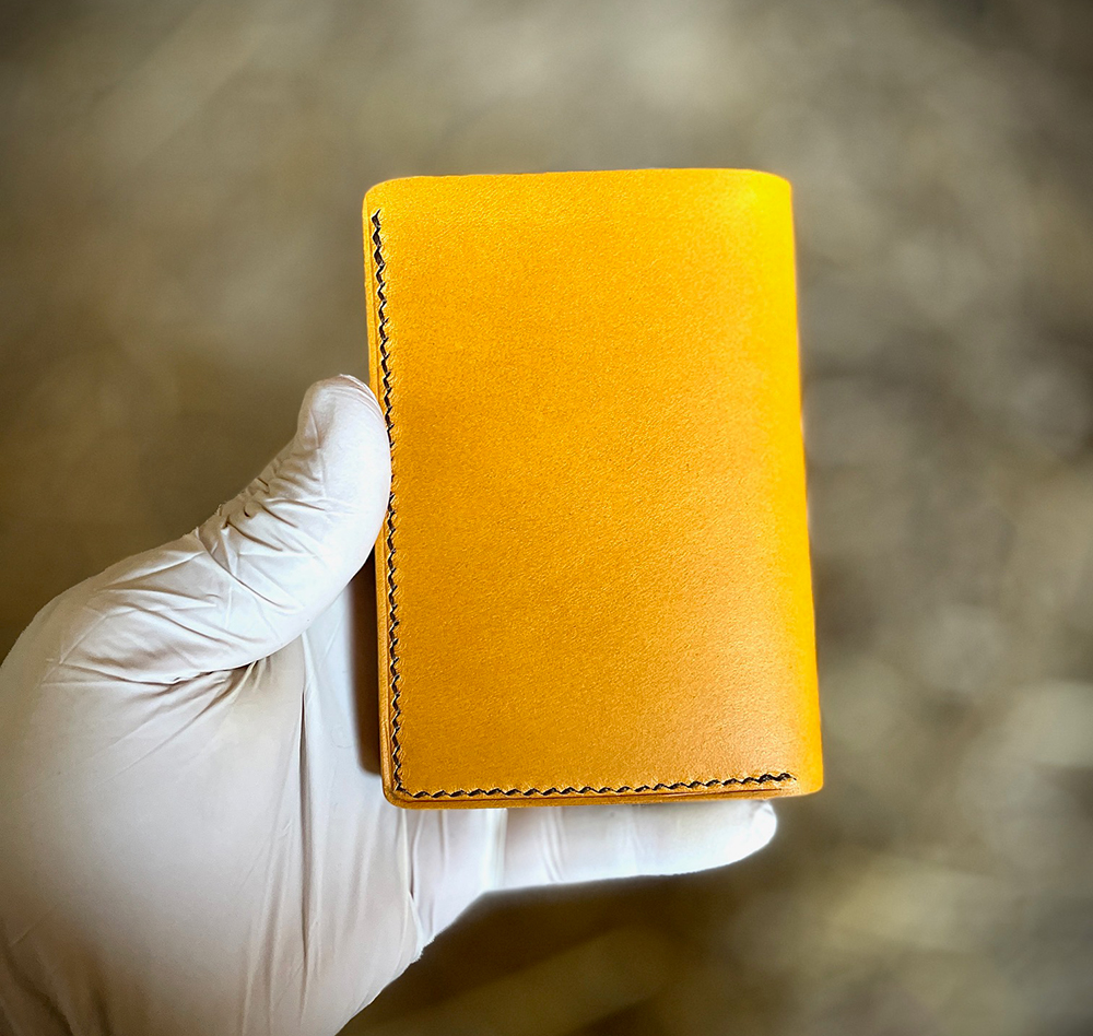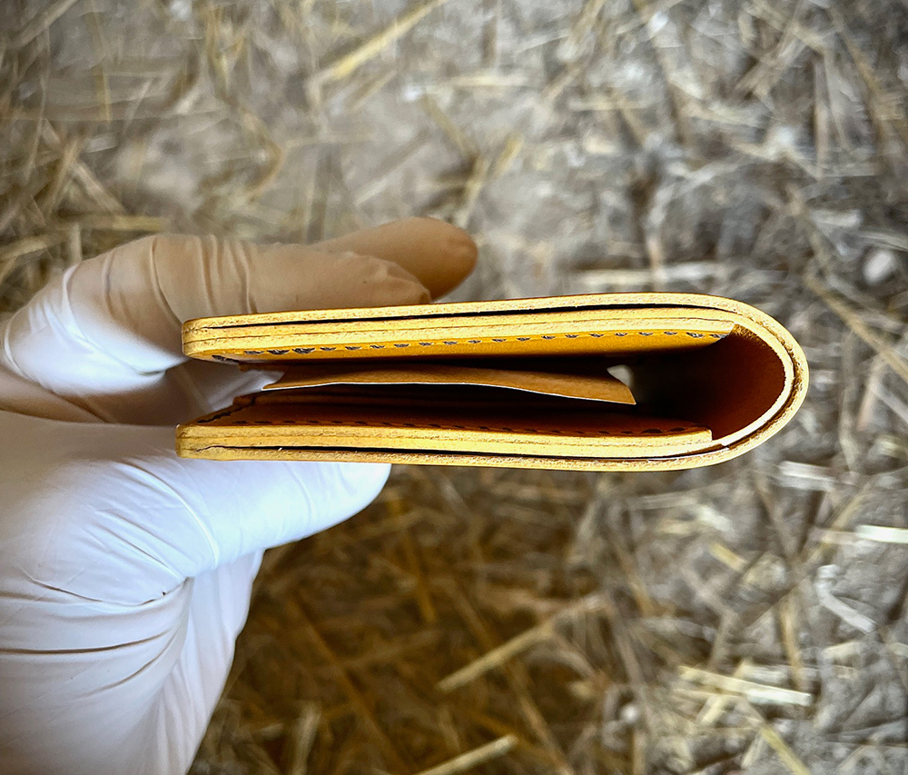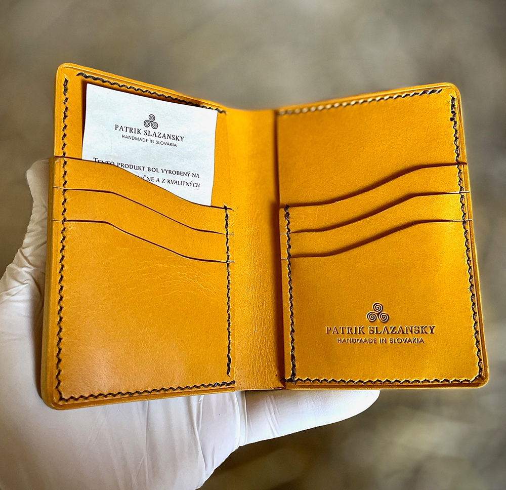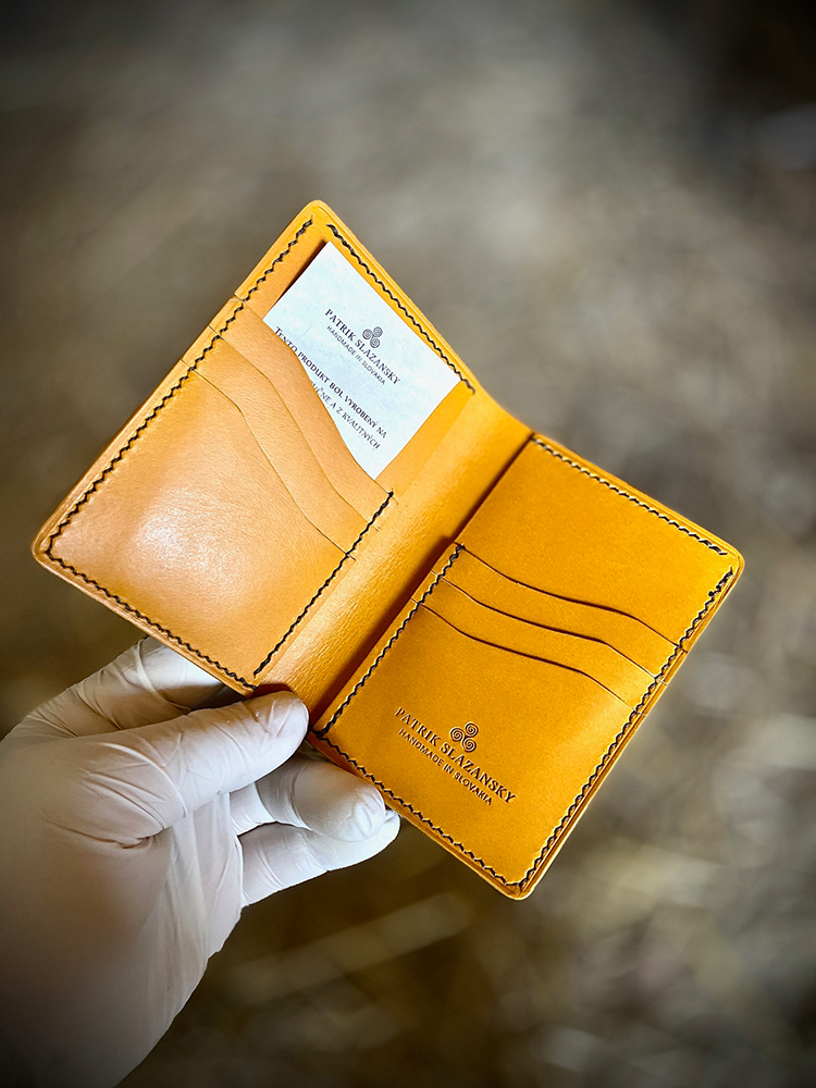 Ručne šitá peňaženka na šesť kariet, bankovky a dve vnútorné vrecká. Ručne šité hnedou niťou Vinymo MBT